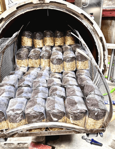 Mushrooms thrive when their oats are properly ‘hydrated’—not cooked—in near-boiling water, and when their CVG has just the right water content, known as Field Capacity.Each Shroom Bomb™ grow bag is then finished using a special piece of equipment called an autoclave (essentially a large pressure cooker).